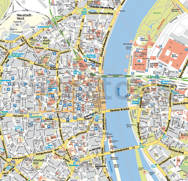 Stadtplan Köln im Vektorformat, Maßstab 1:20.000. Diesen können Sie als editierbare AICS3-Vektorgrafik für das gesamte Kölner Stadtgebiet in unserem Online-Shop maps-to-go.com kaufen (auch individuelle Ausschnitte sind möglich)