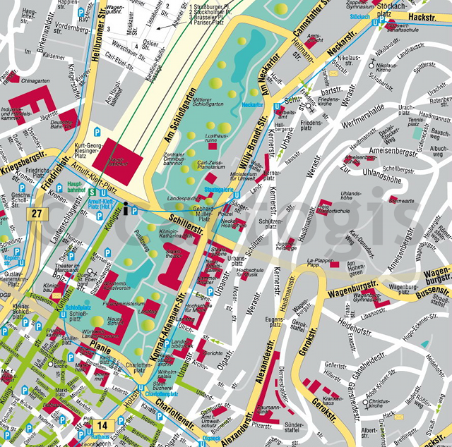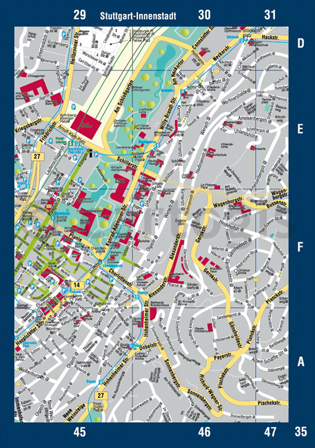 Stadtplan Stuttgart für das Branchenbuch "0711 aktuell" mit eigenen Signaturen (3D-ähnliche Baumdarstellung) und kundenspezifischer Gestaltung.