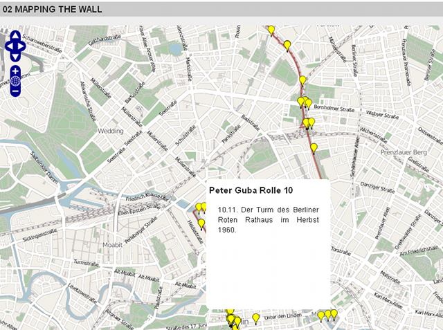 Beispiel: DHM Mauerkarte von cartogis, basierend auf OpenStreetMap für das Deutsche Historische Museum (DHM) in Berlin: als Kartengrundlage der Filmothek zur Verortung von Stills (Filmausschnitten) des Filmarchivs wurde, statt Google Maps, eine von uns individuell gestaltete OpenStreetMap-Karte genutzt.